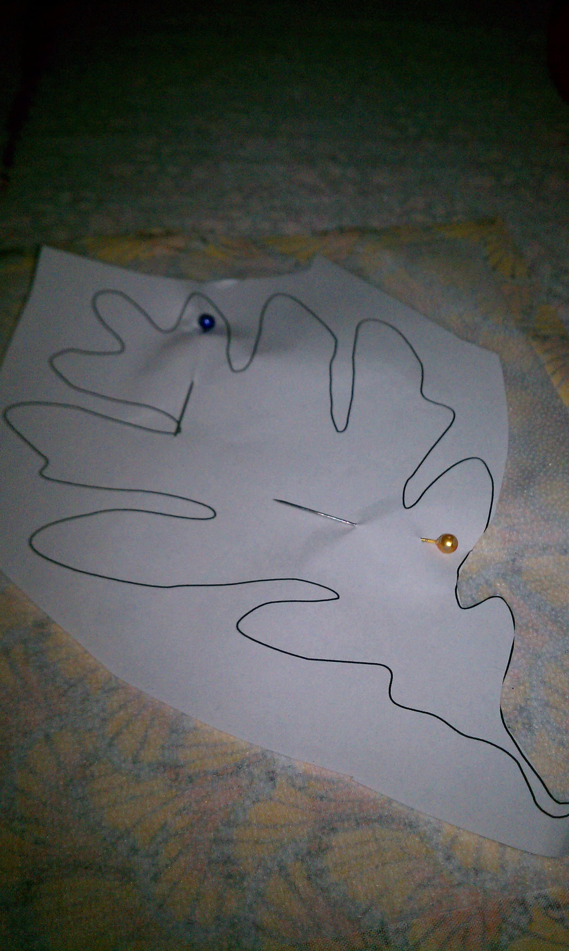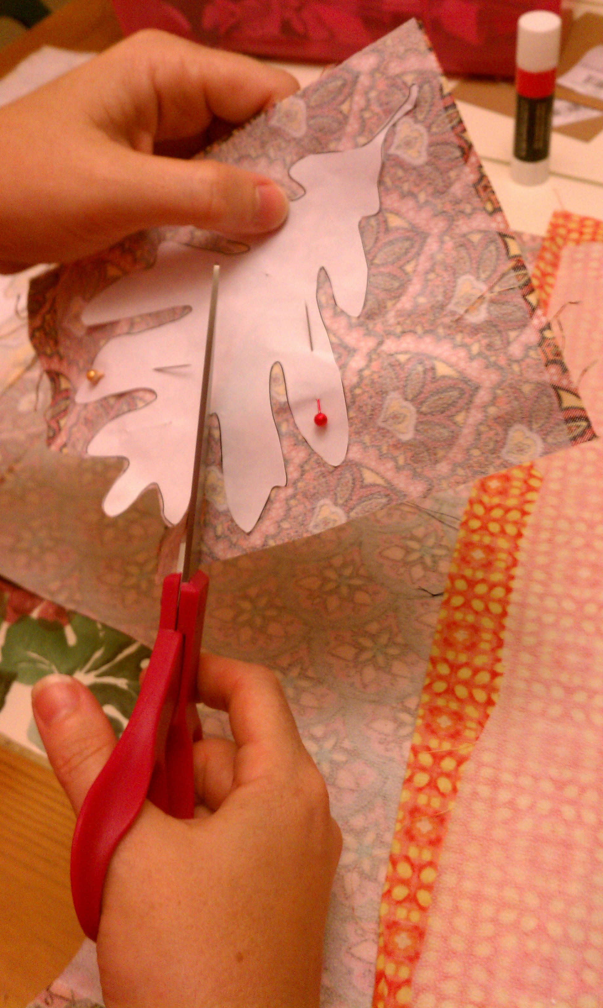 5. Pin the leaf designs to the fabric with the interfacing and cut it out.Tip: I used a fabric glue stick to attach the leaf designs before pinning it, so it would not move while sewing.